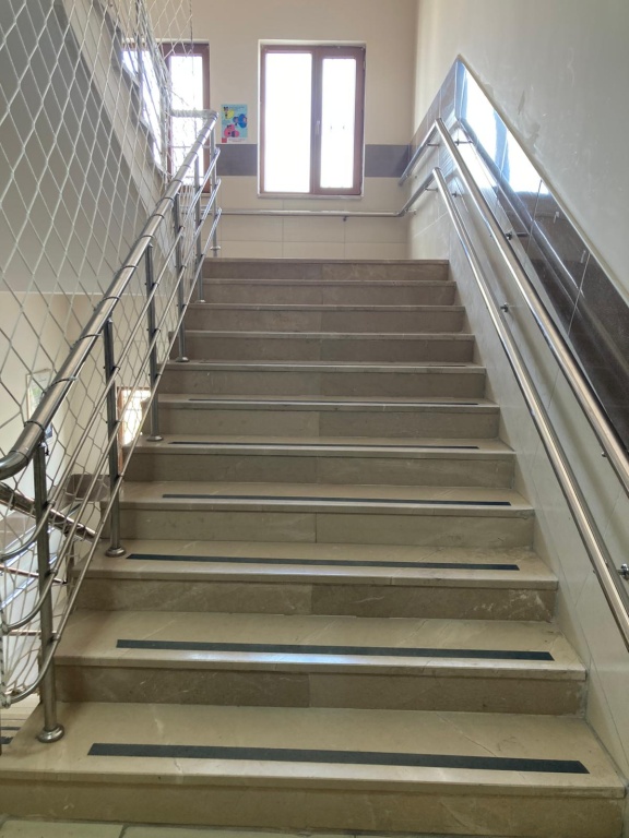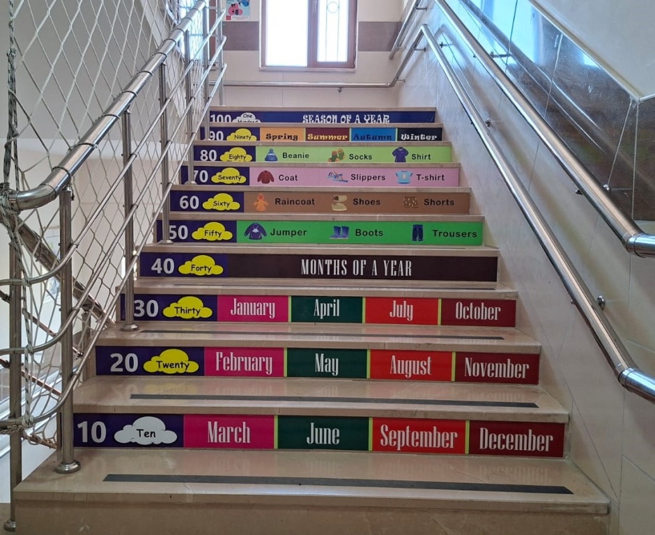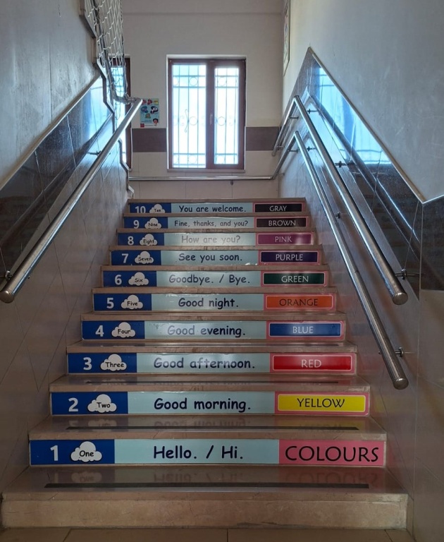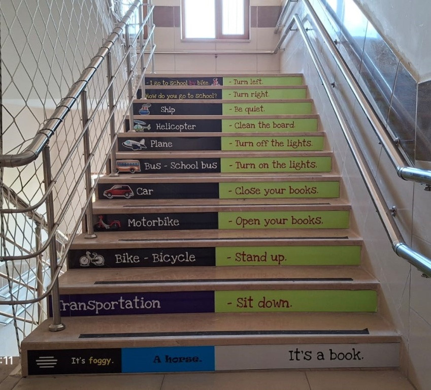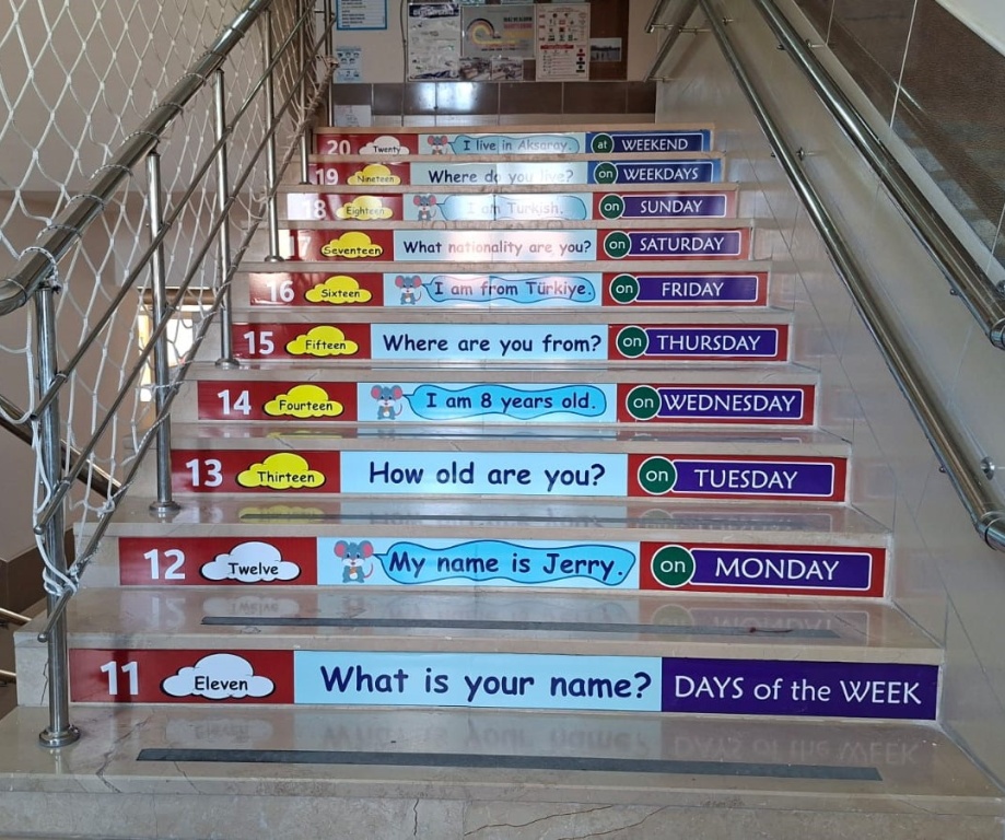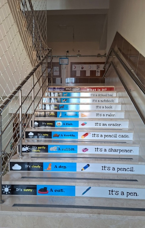 Okulumuzun merdiven basamaklarına İngilizce dersine ait eğitici materyaller yapıştırıldı. İngilizce materyaller ile öğrencilerimizin ders dışında teneffüs zamanlarında dikkatlerini çekerek öğrenmelerinin pekiştirilmesi amaçlandı.
